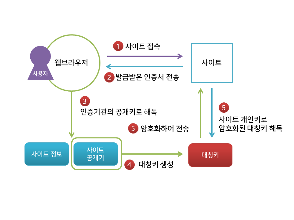 그럼 사용자는 대칭키를 생성해 해당 키를 인증서에 들어있는 서버의 공개키로 암호화에 사이트에 보낸다.