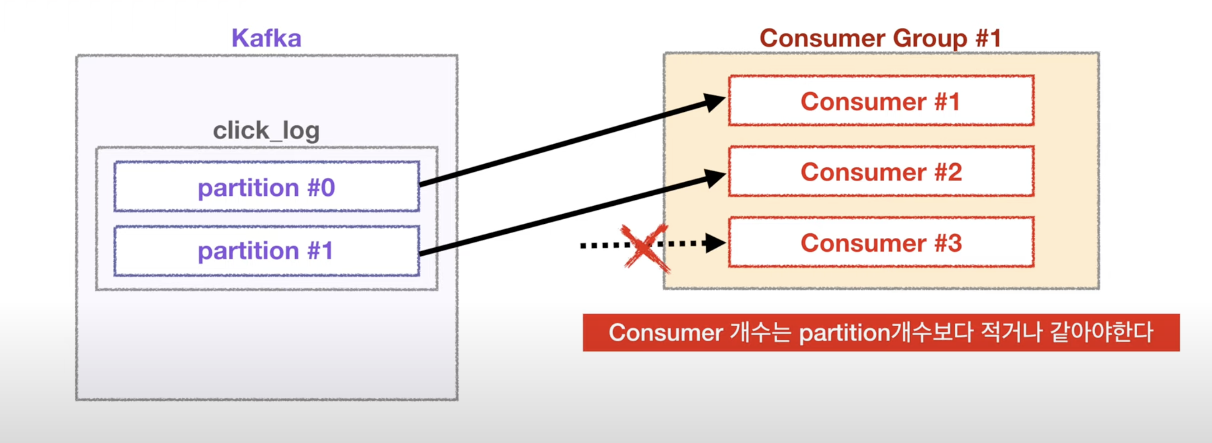 한 커슈머 그룹에서는 한 topic내에서 파티션과 consumer그룹의 consumer가 일대일 대응입니다.