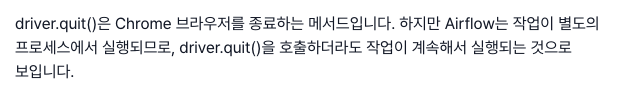 기존에 github action으로 crawler를 스케쥴링해놨었는데, github action의 cron은 표기보다 30분~한시간 랜덤으로 늦게 실행되어서(무료 서버다 보니) airflow로 옮기게 되었다. 그런데 airflow로 크롤링 시 자꾸 특정 코드 다음으로 안넘어가는 문제가 발생했다. 초기엔 webdriverManger.install()에서 해당 문제 발생 이에 webdriverManager가 아니라 직접 수동으로 webdriver를 다운 받아 사용했다. 하지만 다음번엔 driver.quit() 에서 문제 발생 크롤링에 로그인을 하고 다른 페이지로 리다이렉션하는 로직이 있어서 그런가 하여 headless 모드를 끄고 단순히 driver.get()이후 driver.quit() 하고 로그를 남기는..